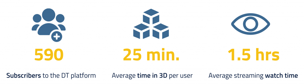 The Deutsche Telekom hybrid exhibition booth at MWC 2022 was a success: with 590 subscribers to the DT platform who spent an average of 25 minutes (per user) in the 3D space. The average watch time in the live stream was 1.5 hours, indicating the appeal of the content and design.