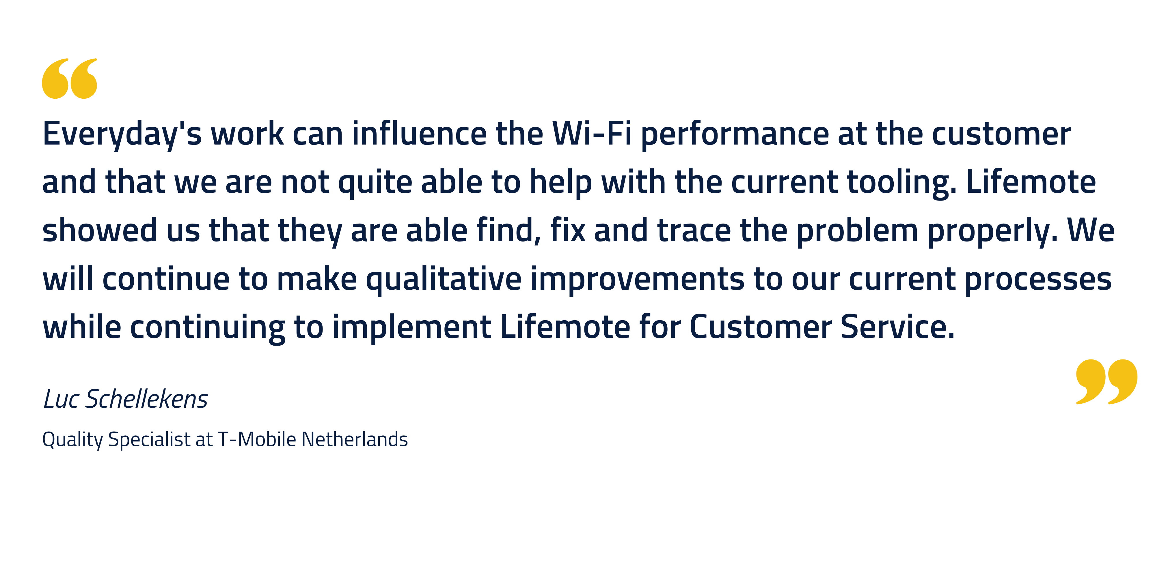 Focusing on making sure every T-Mobile Netherlands subscriber can enjoy the capacity of their Internet connection on all of their home devices, Lifemote technology will enable the T-Mobile support center and network engineering organizations to gain actionable insights into any individual or population level bottlenecks hindering subscriber Quality of Experience. Working with expert Lifemote field teams these organizations will thus be able to adopt both reactive and proactive care best practices to improve key metrics such as repeat complaints, total inbound complaints, average call handling time, and truck rolls.